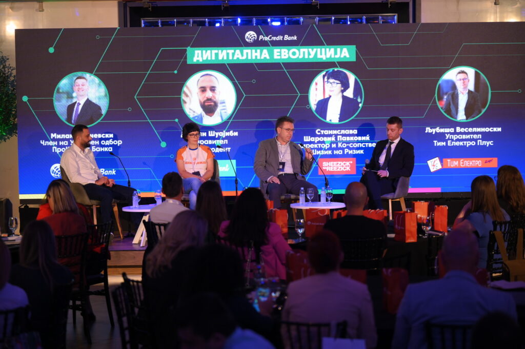 По презентациите се одржа панел дискусијата „Дигитална трансформација – предизвици и можности“, модерирана од Милан Дамчевски, член на Управниот одбор на Прокредит Банка, на којашто Дритан Шујаиби од Маратодент, Љубиша Веселиноски од Тим електро плус и Станислава Шаровиќ Павковиќ од Шизик на ризик ги споделија своите искуства со дигиталната трансформација.