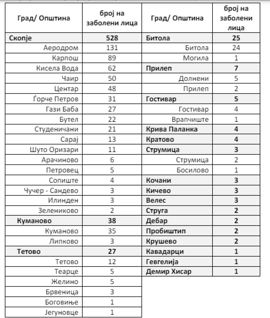 Сè уште најголем број заболени лица се регистрирани на територија на Скопје – 79,9 отсто, а случаи се регистрирани и во 18 други градови низ државата.