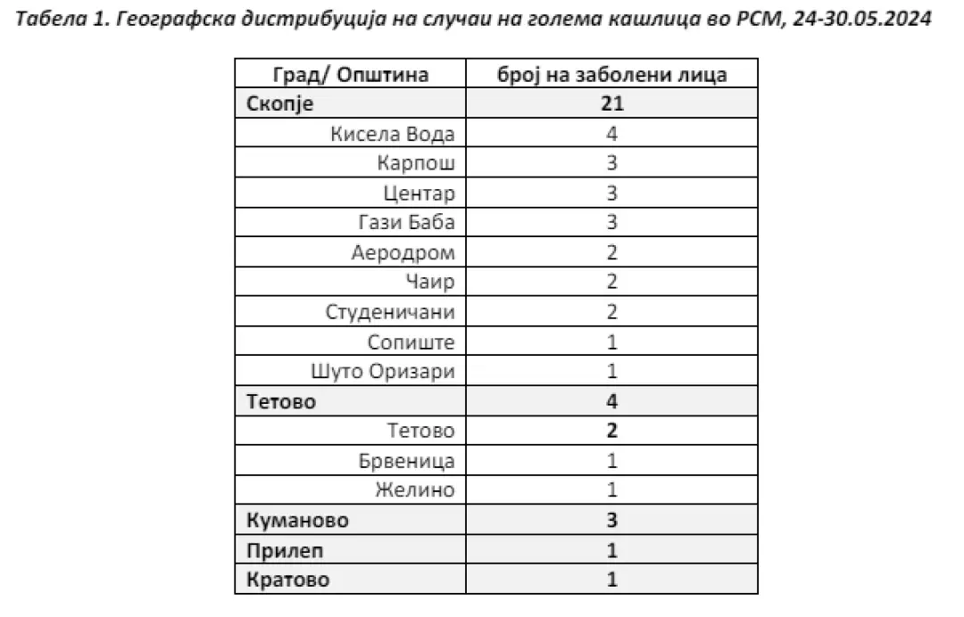 Покрај во Скопје, од новите 30 случаи, .четири случаи се регистрирани во Тетово, три во Куманово и по еден во Прилеп и Кратово. Возраста на заболените се движи од еден месец до 77 години. Најголем број случаи се од возрасната група под една година.