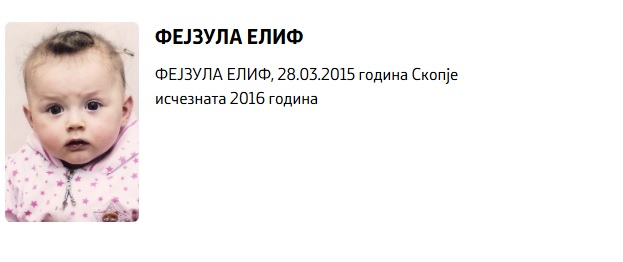 Најмладото исчезнато лице е Фејзула Елиф, родена на 28 март 2015 година во Скопје, која исчезнала во 2016 година за време на катастрофалните поплави во Стајковци. Во моментот на исчезнувањето имала само една година, а нејзиниот случај и денес е еден од најболните симболи на трагедијата што ја погоди скопската котлина. Надојдената вода ја однесе Елиф во непознат правец пред очите на најзините родители, кои заедно со неа се враќаа од гости. Не успеале да ја спасат, а малото девојче никогаш не беше најдено.