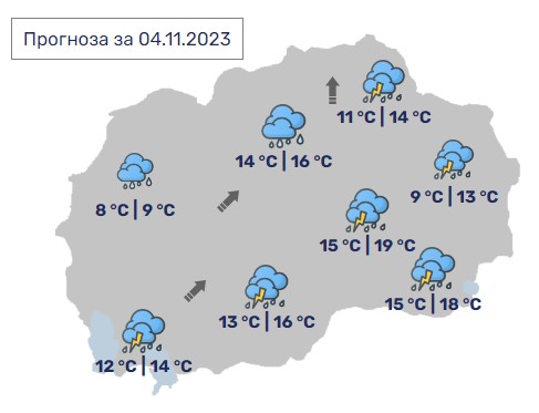 Минималната температура ќе биде во интервал од 9 до 15, а максималната ќе достигне од 13 до 19 степени. Во Скопје утринската температура изнесува 14 степени и не се очекува да се искачи над 16 степени во текот на денот.