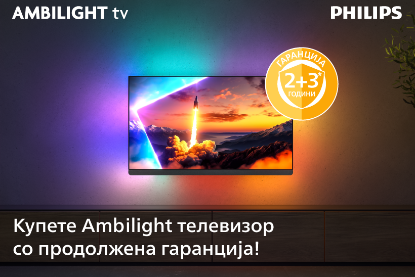 Philips Ambilight TV не е тренд. Тоа е нов стандард. Штом еднаш го доживееш, нема враќање назад! А сега, со продолжената гаранција од 2+3 години, добивате уште поголема сигурност и мир, знаејќи дека вашата инвестиција е целосно заштитена.