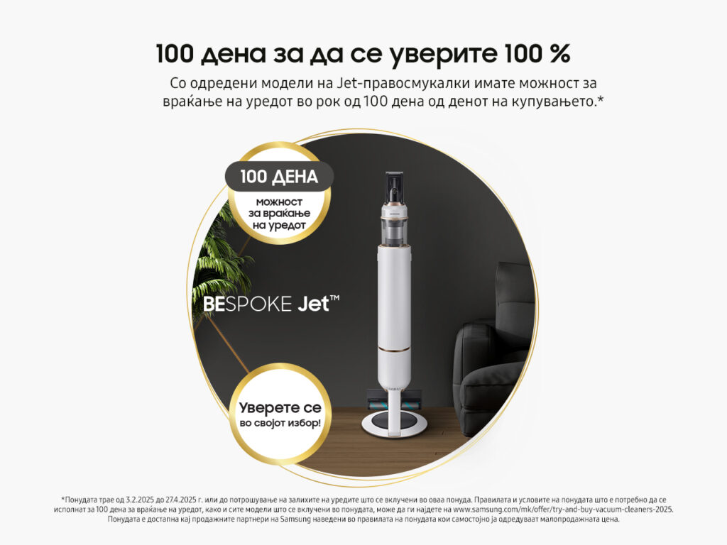 Сега е идеално време да си го дозволите најдоброто за вашиот дом и тоа, селектирани модели на Bespoke Jet правосмукалки имате можност да ги вратите по 100 денови од купувањето. Благодарение на промоцијата Try&Buy на Samsung која ќе трае до 27.04.2025, ќе можете во потполност да се уверите зошто овие одбрани модели на правосмукалки се вистинскиот избор за вас. Повеќе детали можете да прочитате тука.