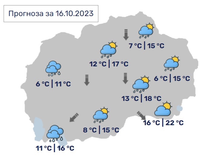Утре времето ќе биде облачно и студено со врнежи од дожд, наместа пообилни. Ќе дува слаб до умерен ветер од јужен правец. Во Скопје облачно со врнежи од дожд и со слаб ветер од променлив правец. Дневните температури ќе се движат од 8 до 16 Целзиусови степени.
