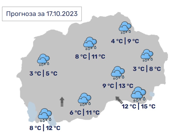 Времето во Македонија денеска ќе биде облачно и студено со повремени врнежи од дожд. Наместа врнежите ќе бидат пообилни, особено во западните делови (над 20 л/м2). Ќе дува слаб до умерен ветер од јужен правец. Минималната температура ќе биде во интервал од 5 до 12, а максималната ќе достигне од 9 до 15 Целзиусови степени.