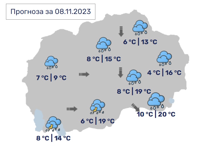 Утре времето ќе биде сончево со мала локална облачност и слаб до умерен ветер од променлив правец. Во Скопје сончево со мала облачност. Ќе дува слаб ветер од променлив правец. Дневните температури ќе се движат од 11 до 18 Целзиусови степени.