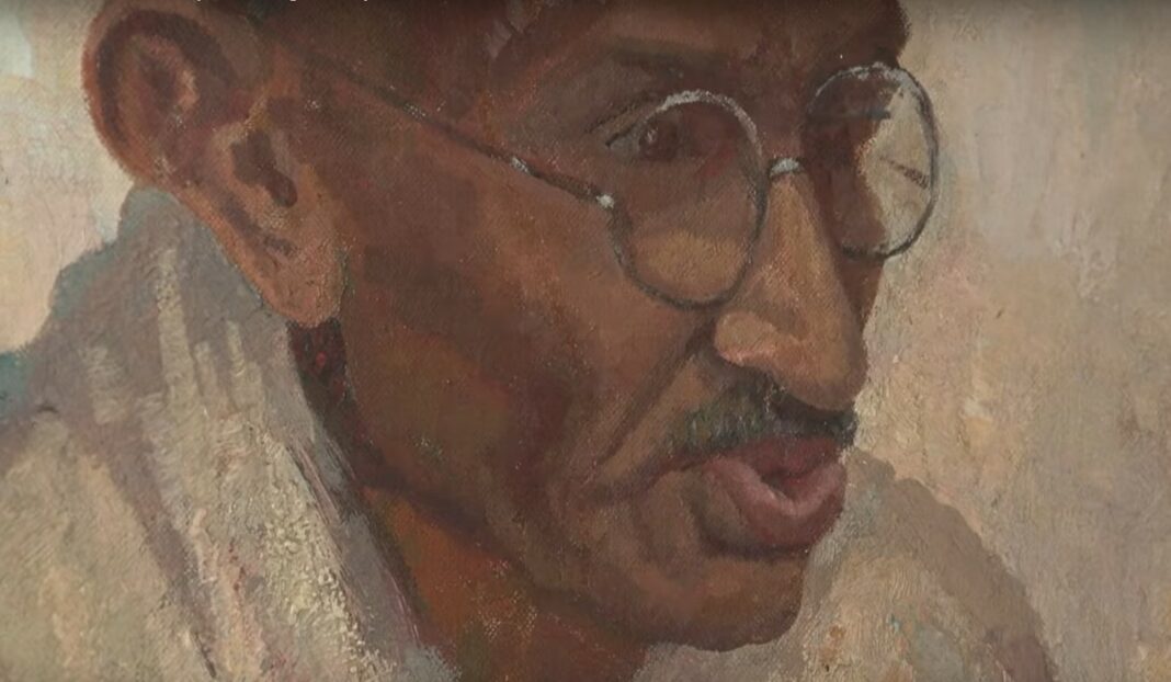 Портретот го насликала британската уметница Клер Лејтон во 1931 година, кога Ганди го посетил Лондон за да присуствува на втората Конференција на Тркалезна маса за уставните реформи за Индија и нејзините барања за самоуправа.
