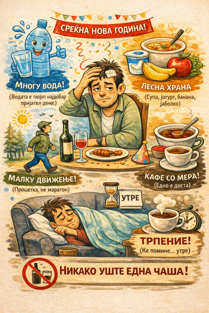 И најважно: не лечете мамурлак со нова чаша алкохол. Тоа е како да го гасите пожарот со бензин — моментално изгледа храбро, ама завршува лошо.
