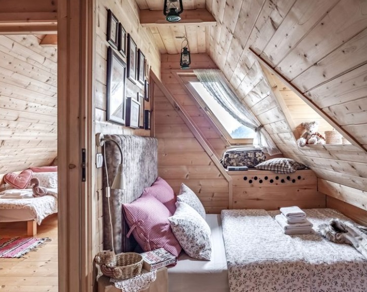 Горе има две спални соби – една поголема со сопствен приватен балкон и многу природна светлина од балконската врата и прозорците. Во собата е сместен и мал кауч и гардероба – под косиот покрив.