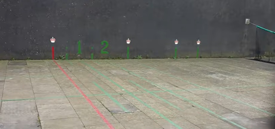 Во што е разликата? Подлогата има несиметрични линии, бројки и круни означени на подот и ѕидови, коишто се користат за пресметување на резултатот. Играчите добиваат дополнителни поени ако ја испратат топката низ дупка во ѕидот.