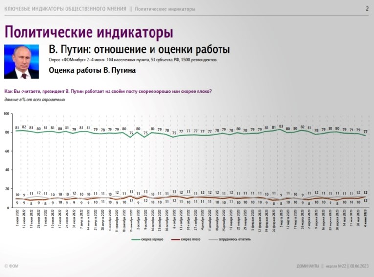 На прашањето дали Путин добро или лошо ја работи својата работа, 77 отсто од Русите одговориле дека добро ја работи, околу 12 отсто мислат дека лошо ја работи, а исто толку не можеле да дадат одговор на прашањето.