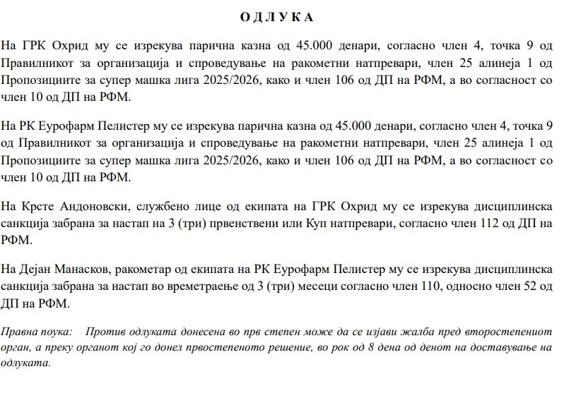 Двата клуба ќе мора да платат и казна од по 45.000 денари.