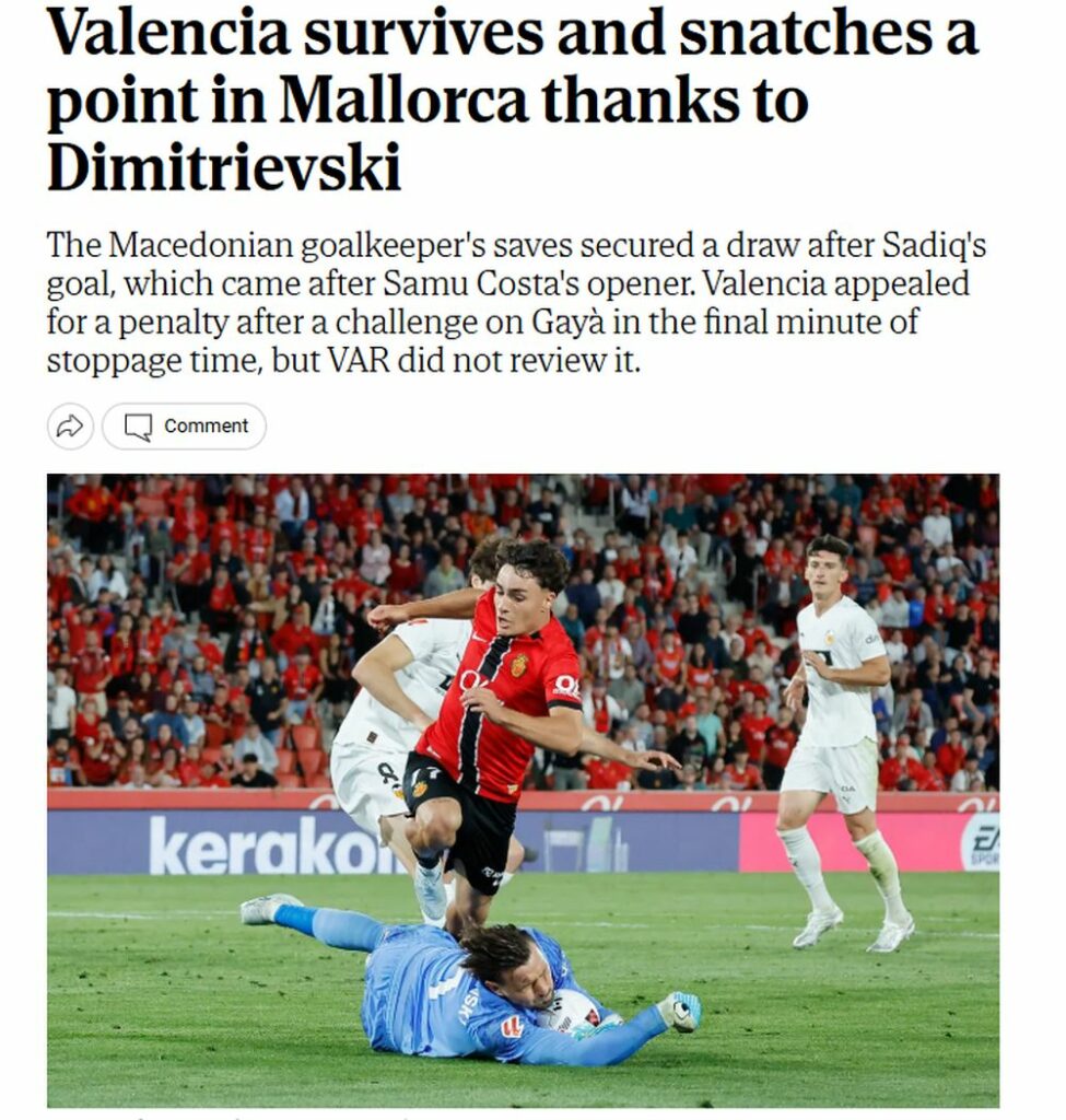Според „Ел Мундо“, Валенсија освоила бод благодарение на Димитриевски.