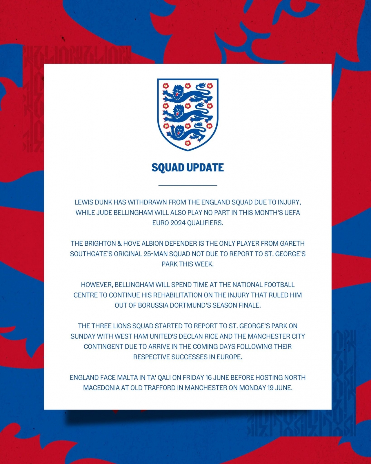 Англија потврди дека Белингем и дефанзивецот на Брајтон, Луис Данк поради повреди нема да играат на престојните квалификациски мечеви против Малта и Македонија.