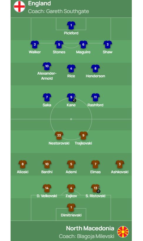 Ударната игла на Англичаните ја сочинуваат Кејн, Рашфорд и Сака. Во средниот ред се Хендерсон, Рајс и Александер Арнолд, централни дефанзивци се Мегваер и Стоунс, а бекови Шо и Вокер, голман е Пикфорд.