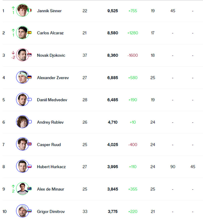 Нов лидер е италијанскиот тенисер Јаник Синер со 9.525 поени, а на второто место е новиот освојувач на Ролан Гарос, Шпанецот Карлос Алкараз со 8.580 поени.