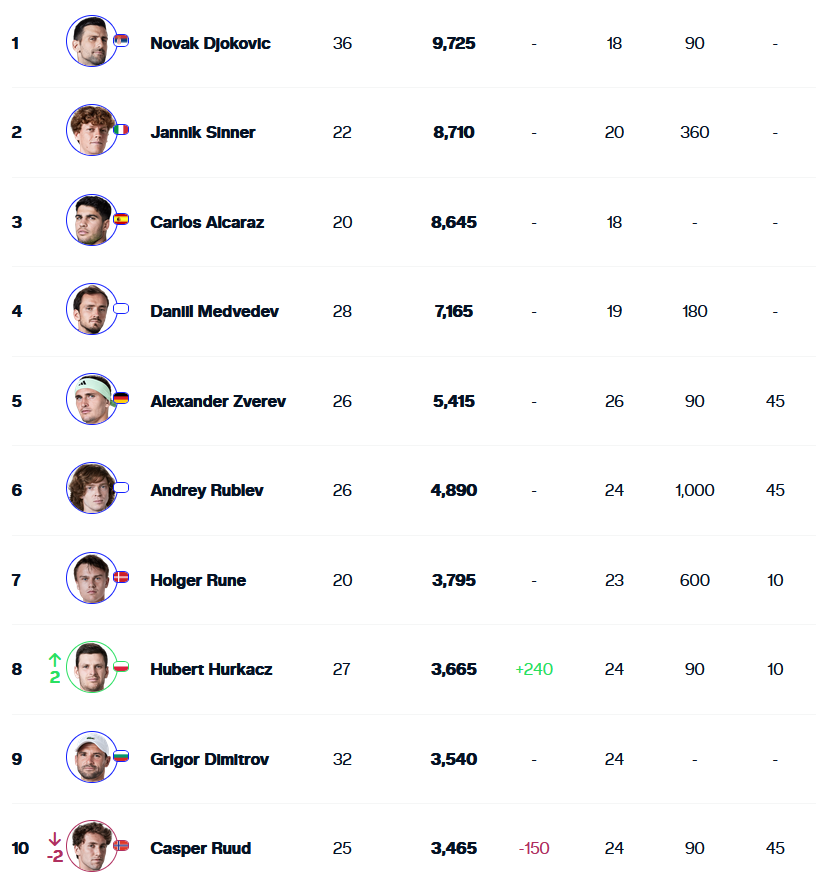 Што се однесува до останатите тенисери, на 36-годишна возраст во топ-10 биле само уште Џими Конорс и Рафаел Надал, но не на првото место.