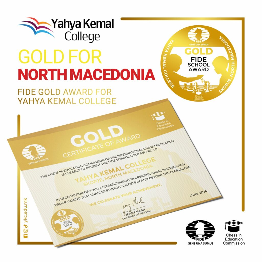 Образовната комисија за шах при ФИДЕ годинава додели над 20 признанија согласно оценетите критериуми за златна, сребрена и бронзена награда. Златниот амблем ПСУ „Јахја Кемал” го доби во конкуренција на шаховски школи од целиот свет и е единствен добитник на оваа награда на ниво на Балкан. Највисокото признание го дели со уште 13 шаховски школи од земји во кои шахот е бренд и доживува најголема експанзија на светските првенства, како на пример Индија, Кина, а во ова друштво се и школи од САД, Шпанија, Бразил и други.
