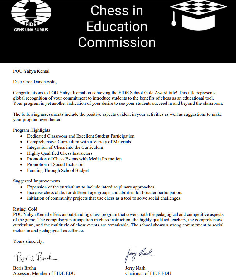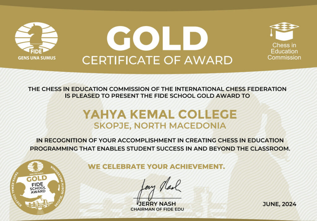 Kомисијата за шах во образованието која, е дел од ФИДЕ, го сертифицираше Јахја Кемал со златен амблем по спроведеното оценување на десет критериуми и активности коишто овозможуваат успешно имплементирање на шахот како дел од образовната програма.
