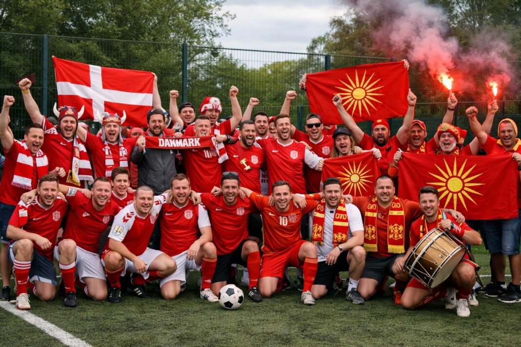 Како загревање за натпреварот меѓу Данска и Македонија кој на програмата е во четврток, ќе се одигра пријателски меч меѓу навивачите на двете репрезентации.