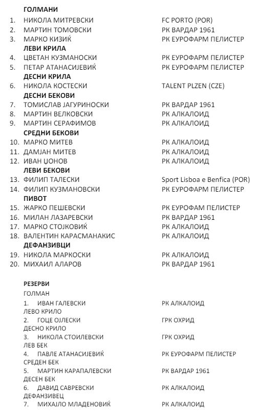 Лазаров за овој клучен двомеч ќе смета на 20 ракометари, а на списокот се и седум резерви. Меѓу повиканите има тројца интернационалци, Никола Митревски (Порто), Филип Талески (Бенфика) и Никола Костески (Плзен).