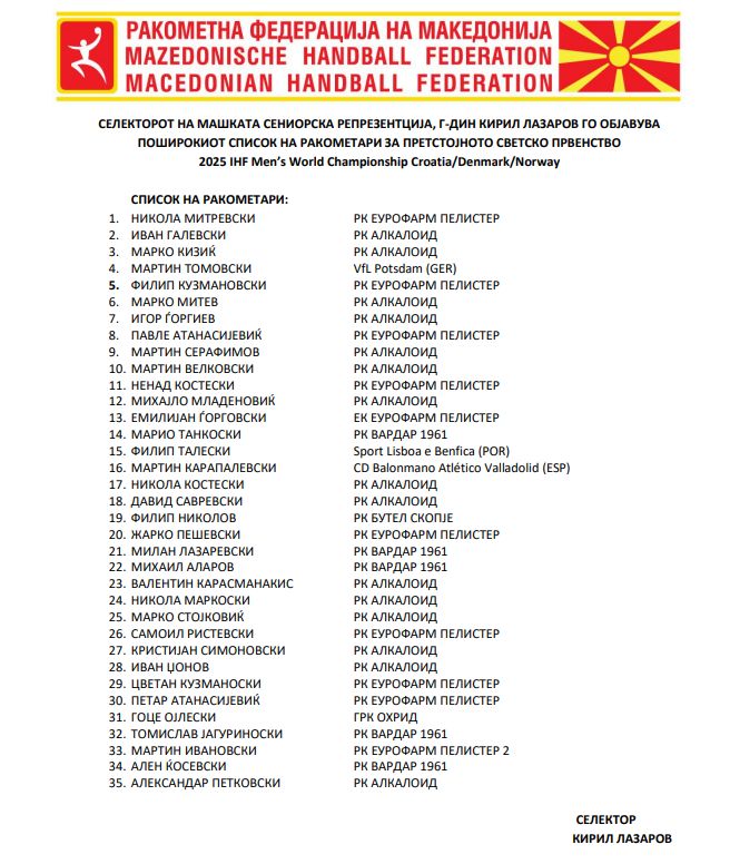 На списокот на селекторот има тројца ракометари кои доаѓаат од странски клубови, голманот Мартин Томовски од Потсдам, Филип Талески од Бенфика и Мартин Карапалевски од Ваљадолид. Останатите повикани играчи се од македонското првенство, грото од трите најдобри клубови, Вардар, Пелистер и Алкалоид.
