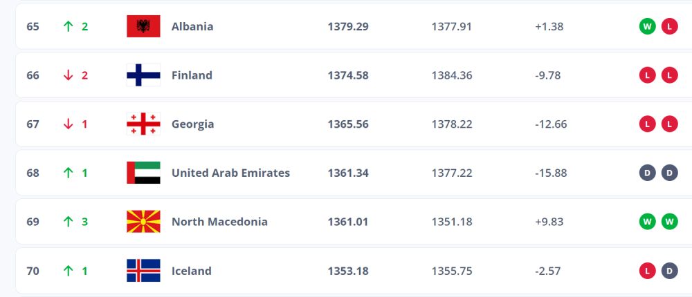 Македонија сега се наоѓа на 69. место на кое последен пат беше во април оваа година. До крајот на годината нашата репрезентација треба да одигра уште два натпревари од Лигата на нации, во Скопје против селекциите на Фарски Острови и Летонија, со две победи може дополнително да го подобриме пласманот.