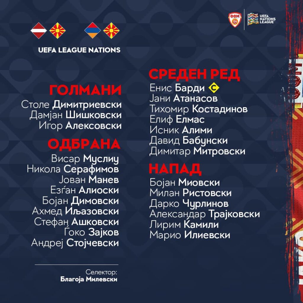 Селекторот на македонската фудбалска репрезентација, Благоја Милевски го објави списокот на фудбалери за престојните натпревари од Лигата на нации.