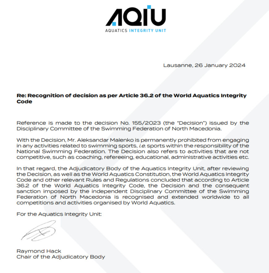 Од НПФ велат дека добиле писмо од Интегритетот во светското пливање со кое се потврдува дека Александар Маленко има меѓународна суспензија.