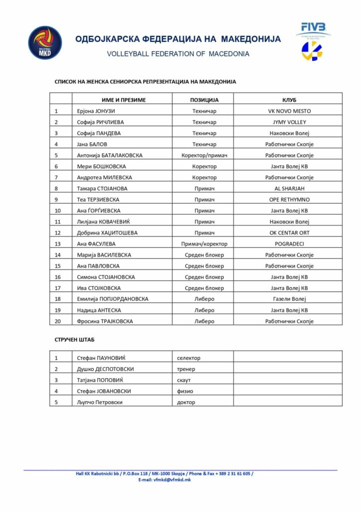 Петте интернационалки, организаторите на играта Јонузи и Ричлиева, и примачите Стојанова, Терзиевска и Хаџитошева ќе бидат основата на селекцијата заедно со колешките од трите најдобри екипи во моментов, новиот шампион Јанта Волеј КВ, финалистот на плеј-офот Работнички Скопје и освојувачот на Купот на ОФМ Наковски Волеј.
