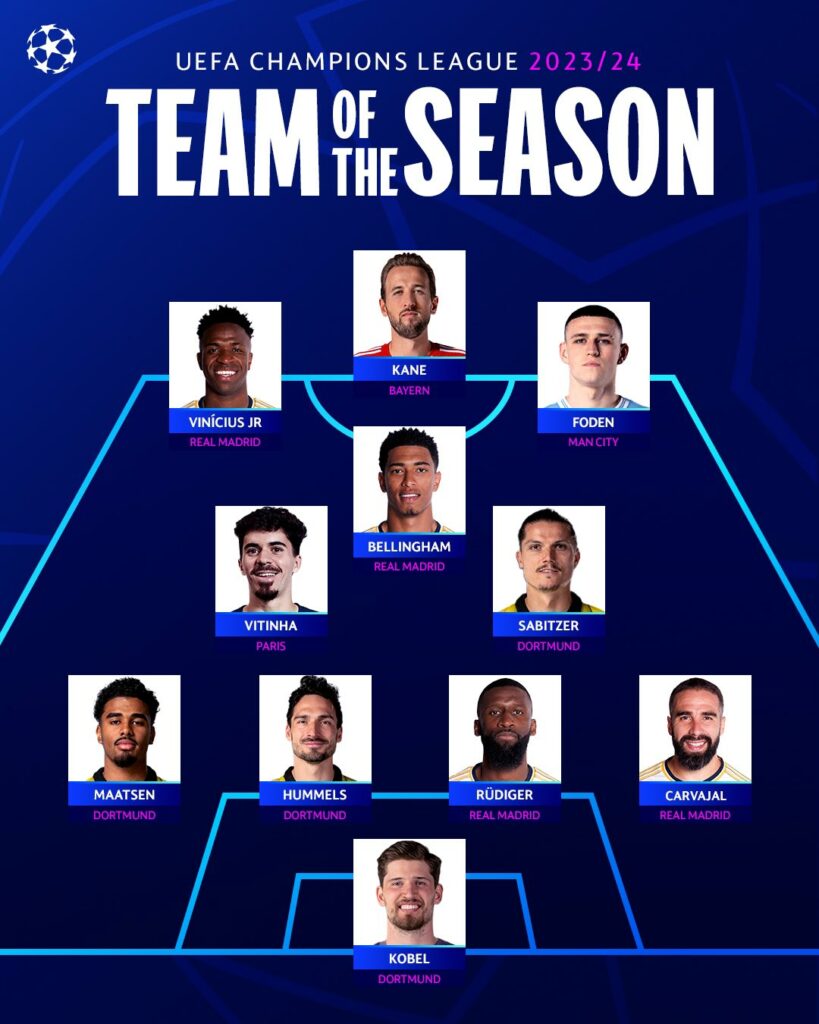 Од тимот на Реал Мадрид се Винисиус, Белингем, Ридигер и Карвахал, од Дортмунд се Кобел, Хумелс, Матсен и Сабицер. Кејн е од Баерн, Фоден од Манчестер Сити и Витиња од ПСЖ.