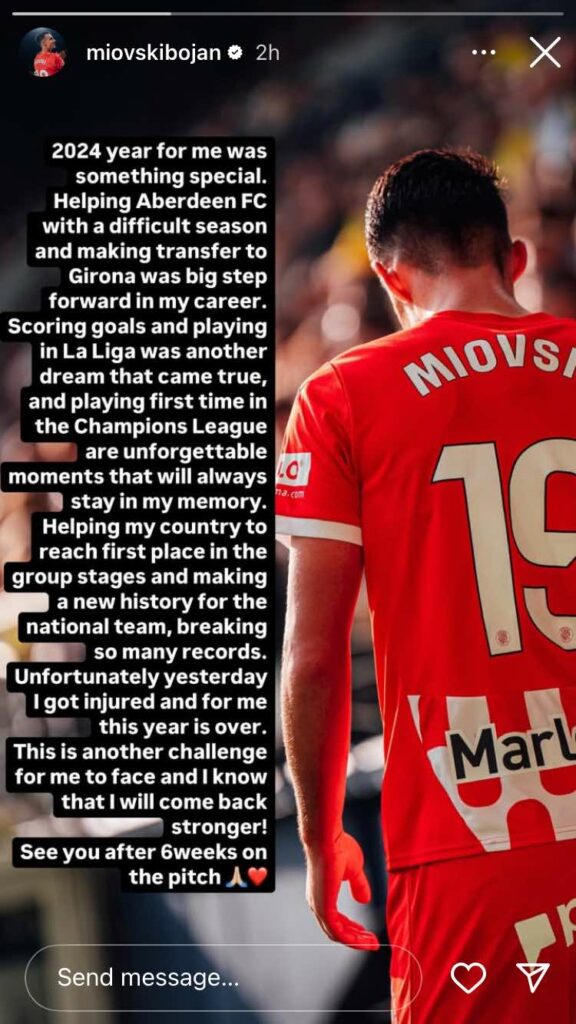 „Оваа година за мене беше нешто специјално. Помошта за Абердин кој имаше тешка сезона и потоа трансферот во Џирона беше голем чекор во мојата кариера. Постигнување голови и играње во Ла Лига се уште едно исполнување на сонот, а исто така и премиерен настап во Лигата на шампионите. Тоа се незаборавни моменти кои ќе ми останат во сеќавање. Исто така и помошта на мојата земја да се освои првото место во ЛН и да се испише нова историја, рушејќи многу рекорди. За жал, се повредив и за мене годината е готова. Ова е уште еден предизвик со кој морам да се соочам и знам дека ќе се вратам посилен. Се гледаме на теренот за шест седмици“, напиша Миовски.