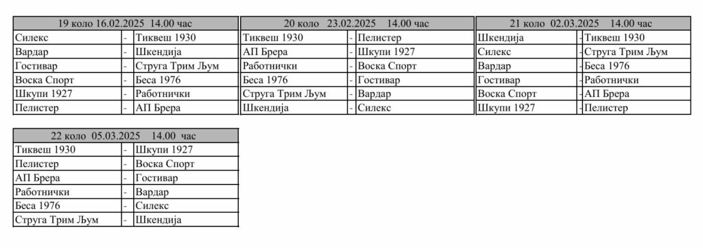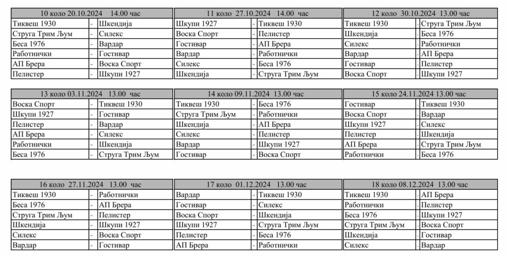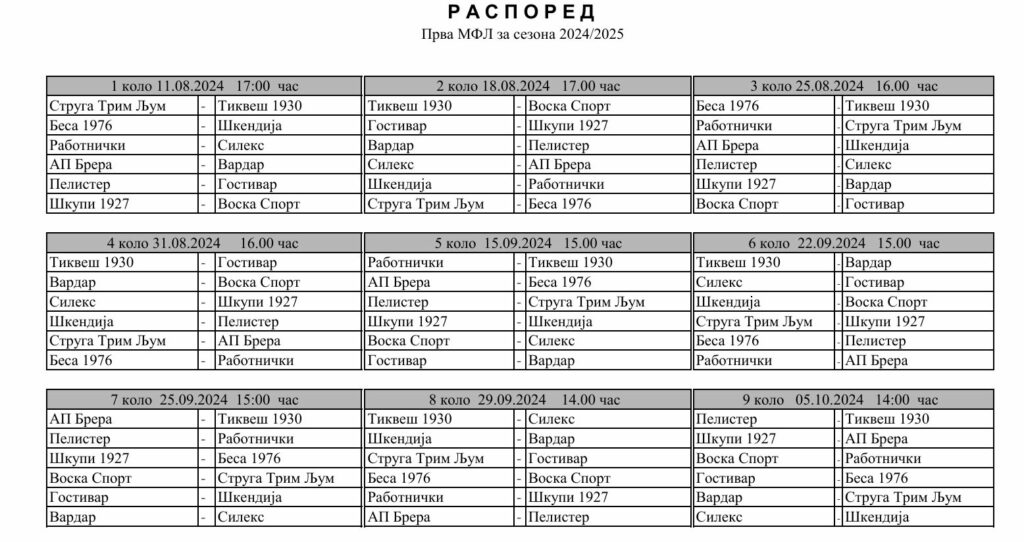 Актуелниот шампион Струга сезоната ја почнува на домашен терен против Тиквеш, реновираниот Вардар кој сега има поголеми амбции во првото коло гостува кај Брера.