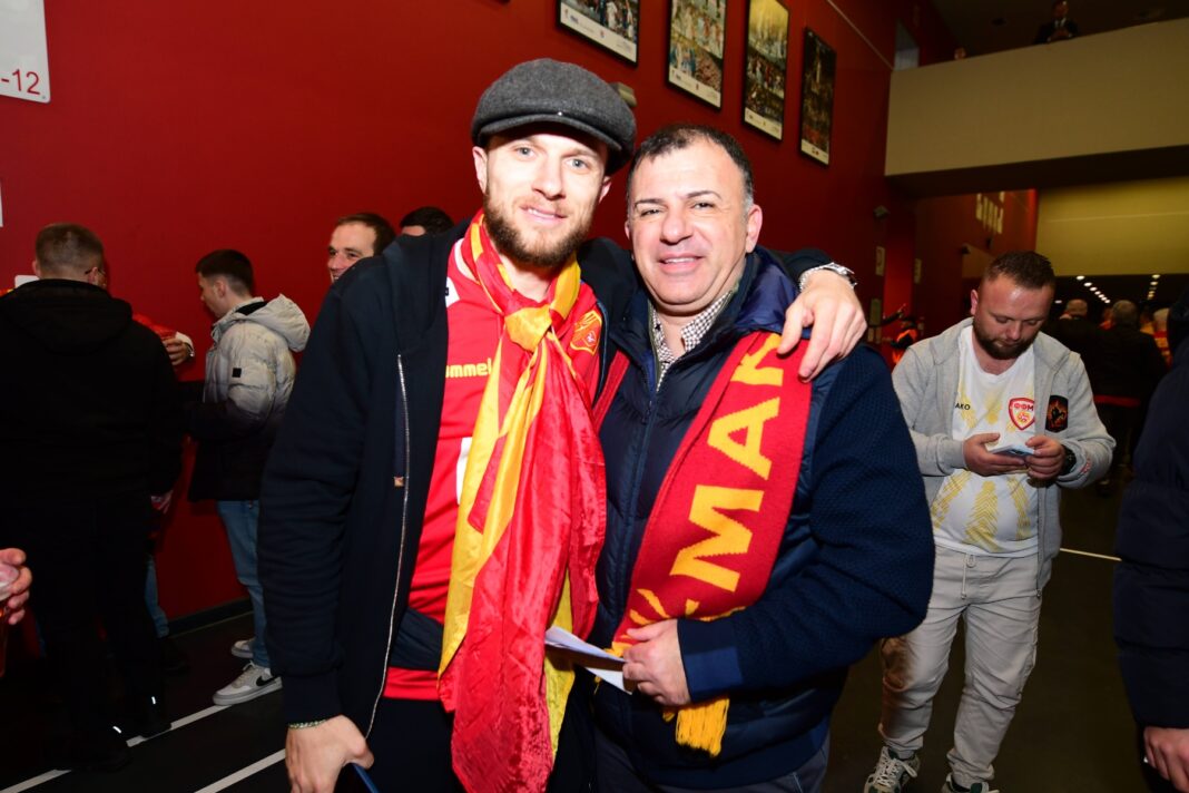 Поранешниот капитен на македонската фудбалска репрезентација Стефан Ристовски и поранешниот селектор на Македонија, Игор Ангеловски ги бодрат ракометарите во Вараждин.