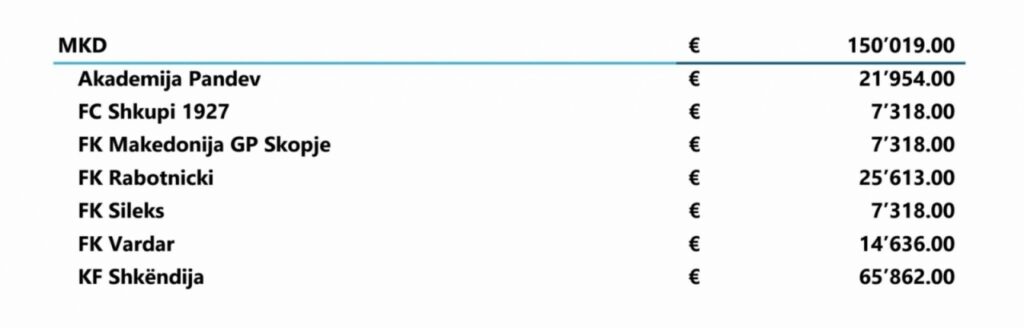 Најмногу од македонските клубови доби Шкендија, 65.862 евра, втор е Работнички со 25.613, нешто помалку оди во касата на Брера 21.954, Вардар доби 14.636, а пари има и за Македонија ЃП, Шкупи и Силекс, трите клуба по 7.318.