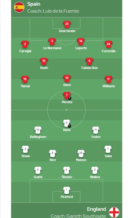 За Шпанија на голот е Унаи Симон, централно во одбраната се Ле Норманд и Лапорте, странично Кукуреља и Карвахал, во средината се Родри и Фабијан Руиз, пред нив е Олмо, страничното дуо е поколниот тандем Јамал и Нико Вилијамс, а напред Мората.