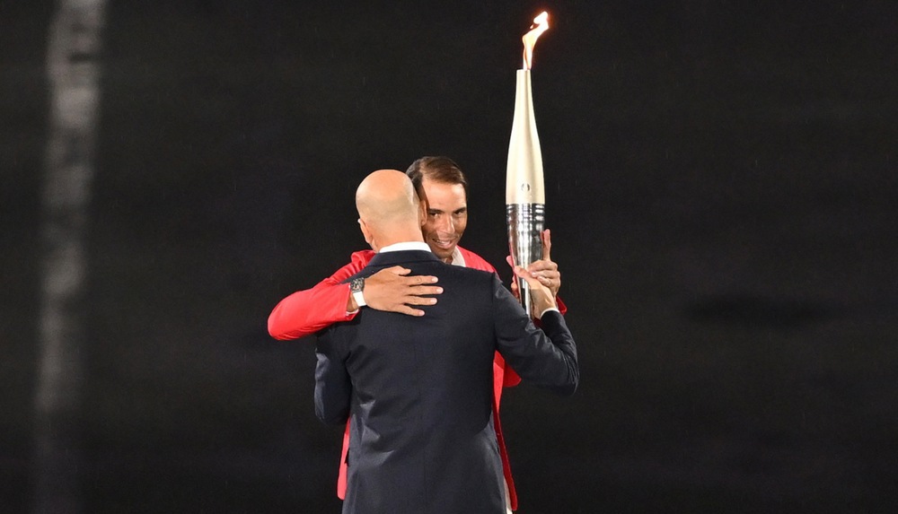 epa11498097 Zinedine Zidane (front) hands the Olympic flame torch to Rafael Nadal (back) at Trocadero during the Opening Ceremony of the Paris 2024 Olympic Games, in Paris, France, 26 July 2024. EPA-EFE/Joel Marklund / POOL