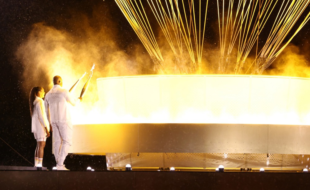 epa11498173 The torchbearers Marie-Jose Perec (L) and Teddy Riner (R) light the cauldron during the Opening Ceremony of the Paris 2024 Olympic Games, in Paris, France, 26 July 2024. EPA-EFE/Jan Woitas / POOL