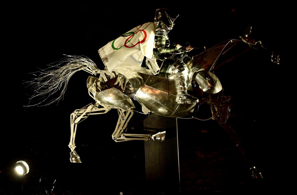 epa11498092 A performer on a metal horse, representation of the Olympic spirit and of Sequana, goddess of the river and symbol of resistance, comes down the Seine river during the Opening Ceremony of the Paris 2024 Olympic Games, in Paris, France, 26 July 2024. EPA-EFE/Pauline Ballet / POOL