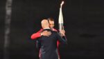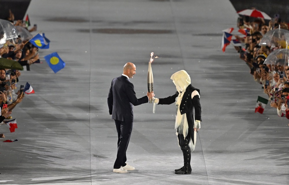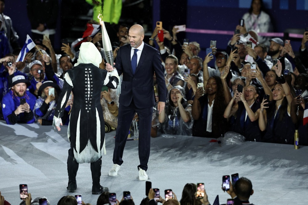epa11498147 French former soccer player Zinedine Zidane receives the Olympic torch during the Opening Ceremony of the Paris 2024 Olympic Games, in Paris, France, 26 July 2024. EPA-EFE/CHRISTOPHE PETIT TESSON / POOL