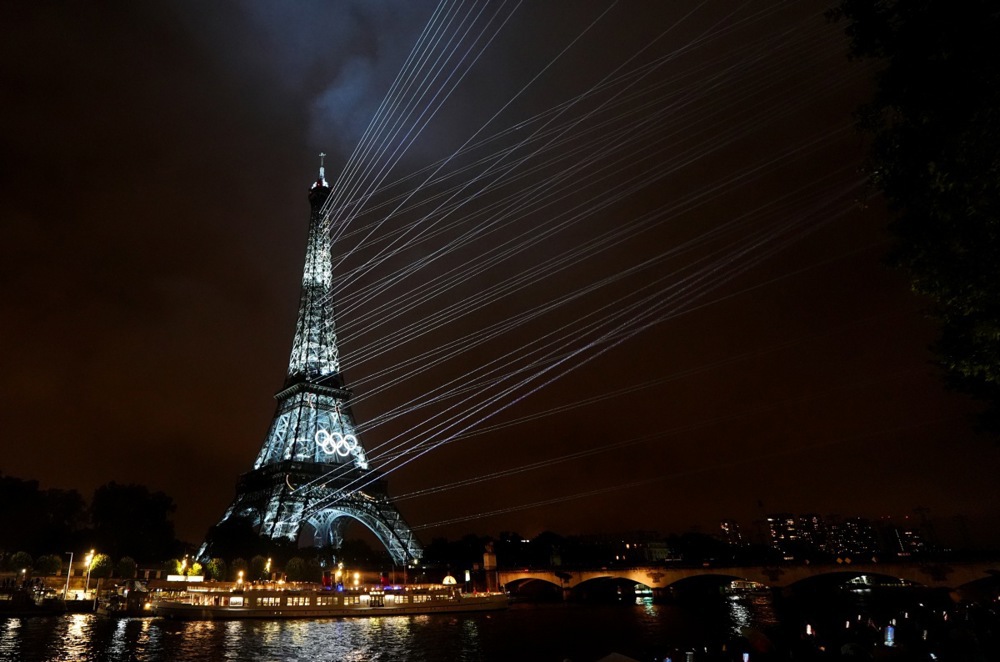 epa11498113 A general view on the laser show at Eiffel Tower during the Opening Ceremony of the Paris 2024 Olympic Games, in Paris, France, 26 July 2024. EPA-EFE/Joel Marklund / POOL
