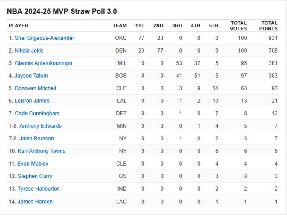 100 НБА инсајдери гласаа за МВП, сите имаа право да распоредат пет кошаркари од прво до петто место.