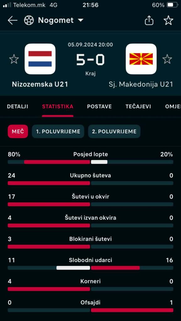 Македонија на овој меч немаше ниту еден шут на голот, имавме само 20 проценти посед на топката. Статистиката кажува се за нашето издание на овој натпревар.