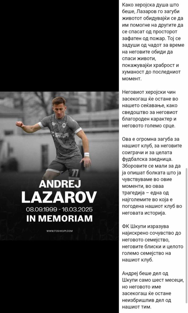 „Лазаров го загуби животот обидувајќи се да им помогне на другите да се спасат од просторот зафатен од пожар. Тој се задуши од чадот за време на неговите обиди да спаси животи, покажувајќи храброст и хуманост до последниот момент. Неговиот херојски чин засекогаш ќе остане во нашето сеќавање, како сведоштво за неговиот благороден карактер и неговото големо срце“, стои во дел од соопштението на Шкупи.