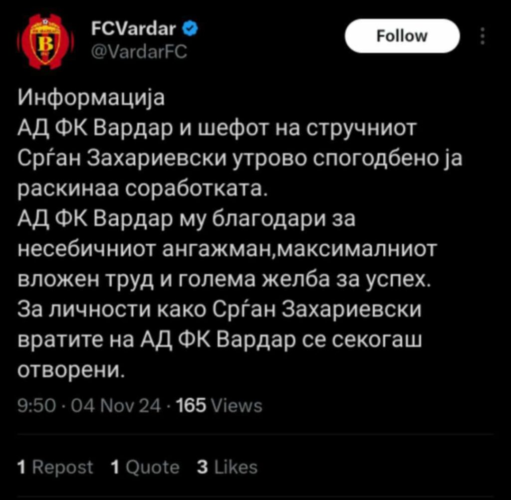 Вардар преку твитер профилот утринава објави дека Захариевски веќе не е тренер на првиот тим.