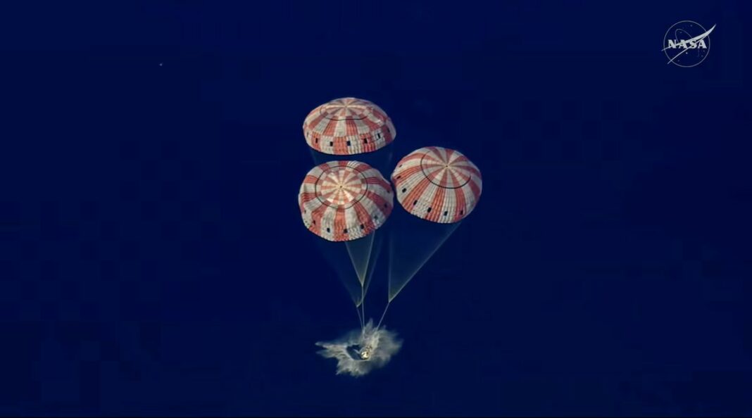 Капсулата Орион на НАСА, во форма на желе бонбона, наречена Интегрити, нежно се спушти со падобрани во мирните води крај брегот на Јужна Калифорнија денеска нешто по 2:07 часот, завршувајќи ја мисијата што четири дена претходно ги однесе астронаутите на 406.700 километри од Земјата, подлабоко во вселената од кој било досега.