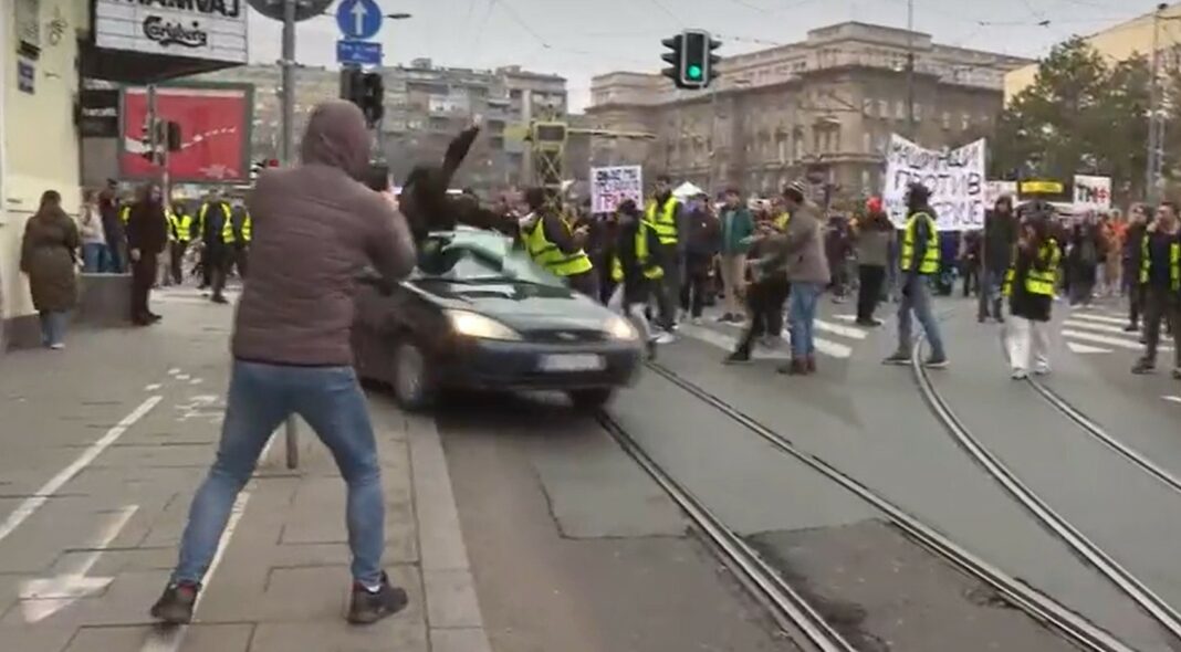 Инцидентот се случи за време на петнаесетминутниот молк во кој студентите и граѓаните им оддаваат почит на загинатите при уривање на настрешница во Нови Сад.
