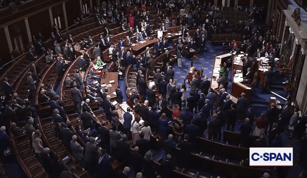 Во меѓувреме, претставничката Ана Паулина Луна, републиканка од Флорида, стана и почна да вика. „Сите вие го предизвикавте ова“, изјави таа. Претседателот на Претставничкиот дом Џонсон се обидуваше постојано да ги смири пратениците, удирајќи со чеканот и повикувајќи на ред. Конечно, тој рече: „Ќе се придружиме на молитвата веднаш по ова, во ред?“