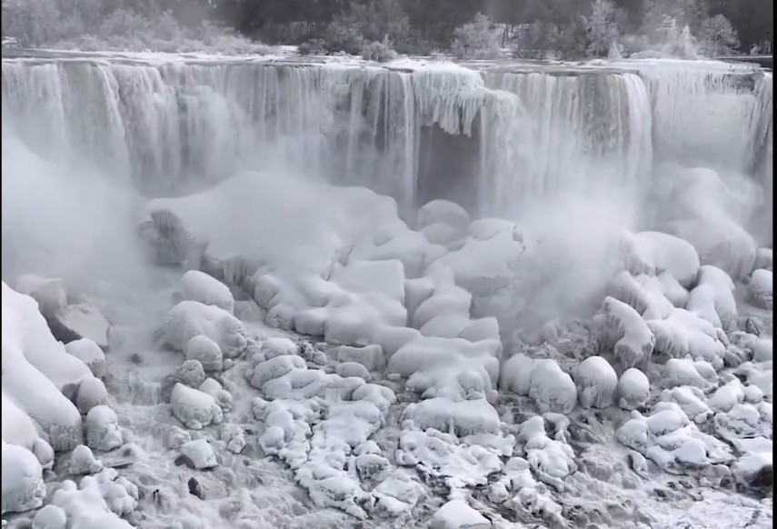 Снимките од дрон покажуваат дебели слоеви мраз и снег околу Нијагарините водопади, кои денес ја означуваат границата меѓу САД и Канада и се една од петте најатрактивни туристички дестинации во светот.
