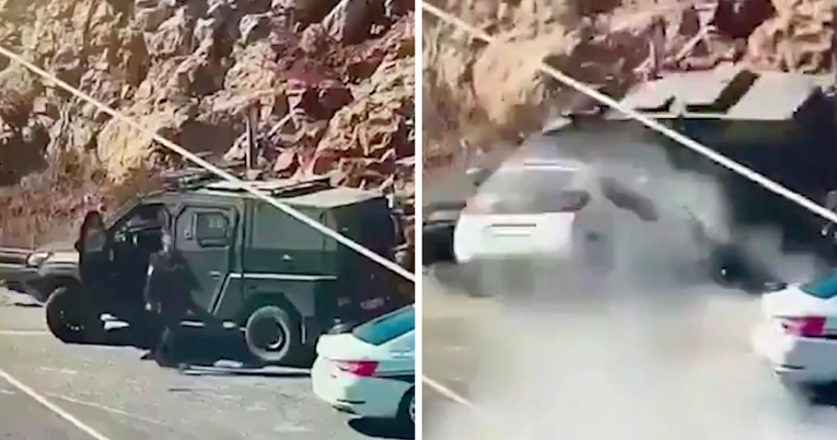 Снимка од безбедносни камери покажува како автомобилот ита кон оклопното возило и полициски патролен автомобил, додека неколку полицајци стојат во близина. Непосредно пред да налета автомобилот, полицаец најверојатно несвесно се тргнал и избегнал смрт.